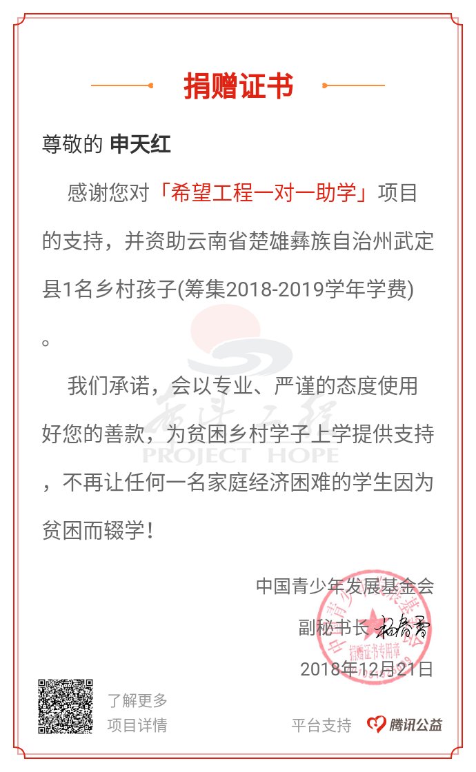 中国青少年发展基金会“希望工程一对一助学”项目献爱心,我司捐资助学云南孩子1名