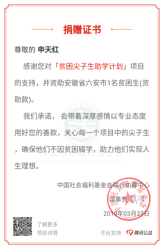 中国青少年发展基金会“希望工程一对一助学”项目献爱心,我司捐资助学安徽孩子1名